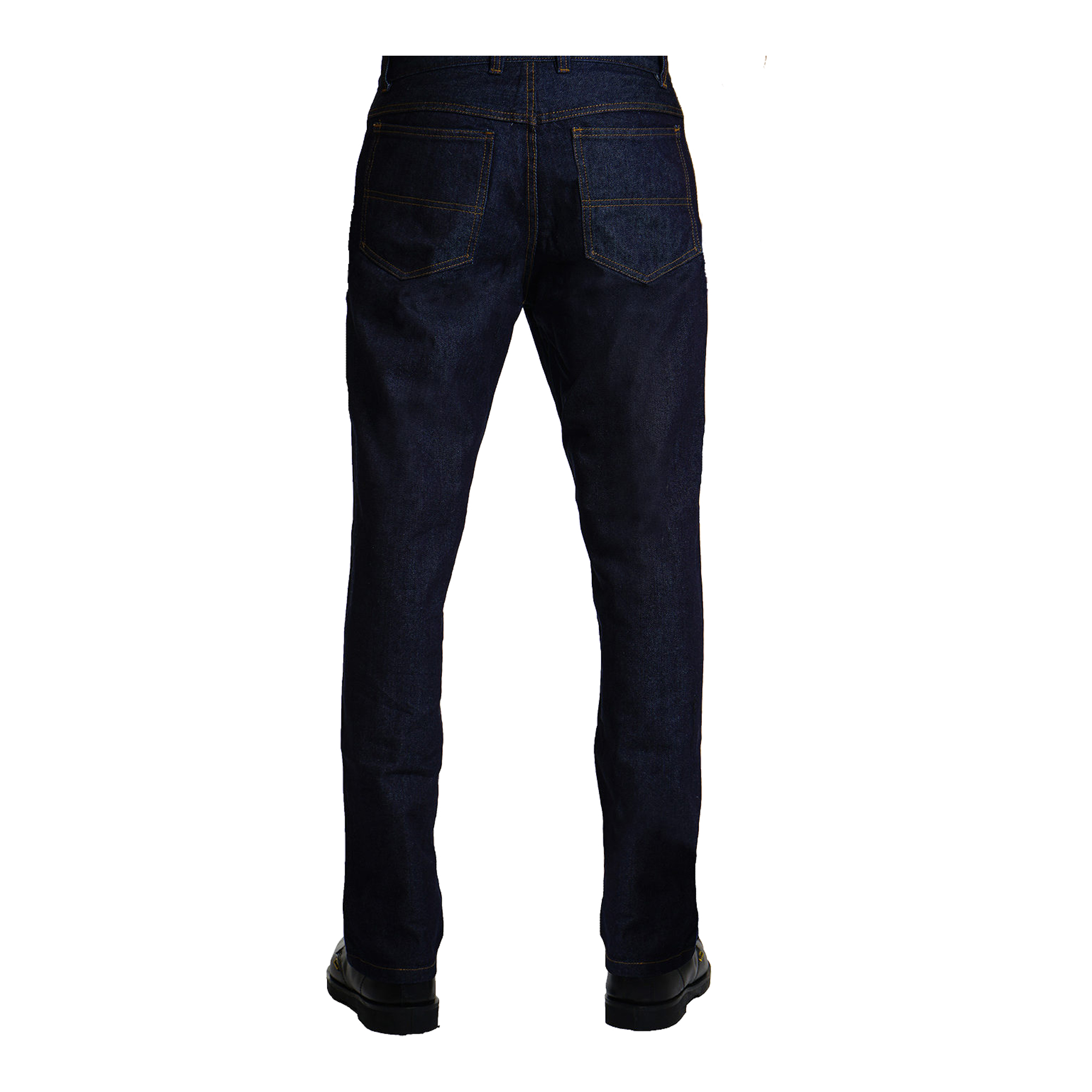 Tiro medio, bota recta, cierre metálico o plástico, dos bolsillos delanteros, relojera, dos bolsillos traseros de tapa, triple o doble costura.